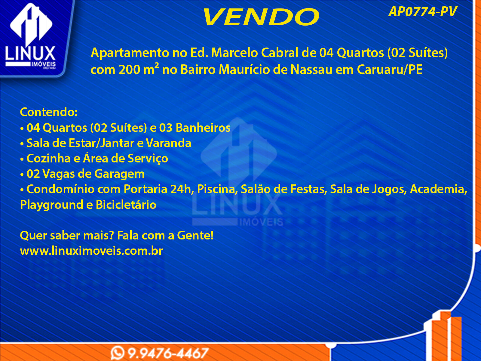 Apartamento no Ed. Marcelo Cabral de 04 Quartos (02 Suítes) com 200 m² no Bairro Maurício de Nassau em Caruaru/PE