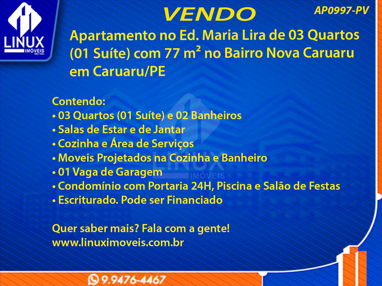 R$275.000,00 / VENDAApartamento no Ed. Maria Lira em Caruaru/PE à Venda (AP0997-PV)