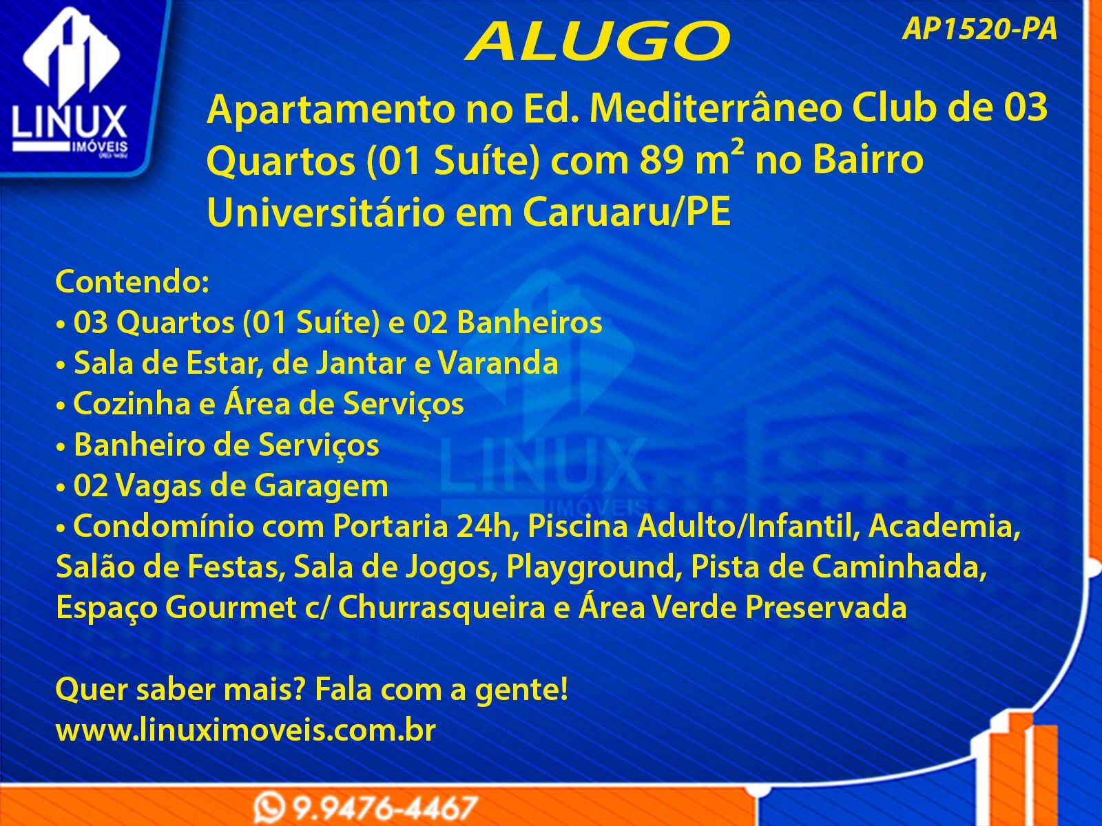 Apartamento no Ed. Mediterrâneo Club em Caruaru/PE p/ Locação (AP1520-PA)