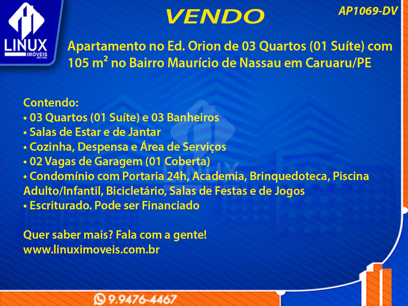 Apartamento no Ed. Orion de 03 Quartos (01 Suíte) com 105 m² no Bairro Maurício de Nassau em Caruaru/PE