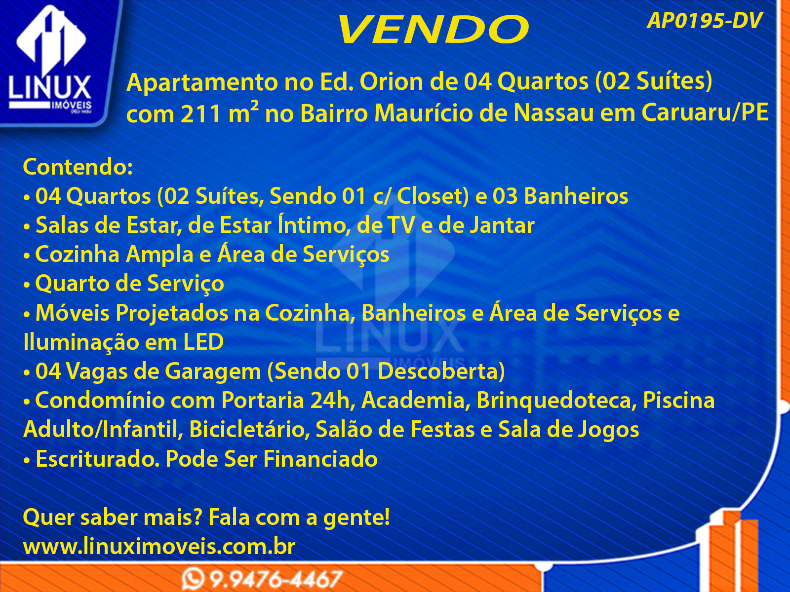 Apartamento no Ed. Orion de 04 Quartos (02 Suítes) com 211 m² no Bairro Maurício de Nassau em Caruaru/PE