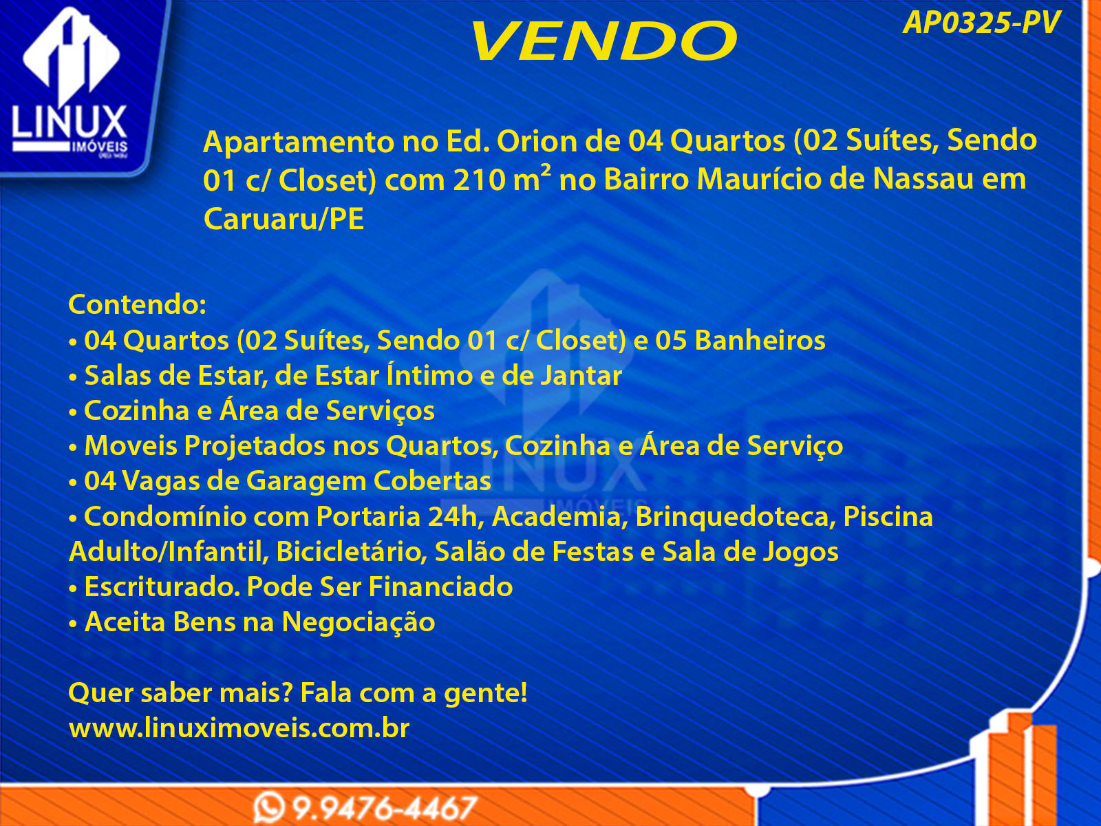 Apartamento no Ed. Orion de 04 Quartos 02 Suítes, Sendo 01 c/ Closet) com 210 m² no Bairro Maurício de Nassau em Caruaru/PE