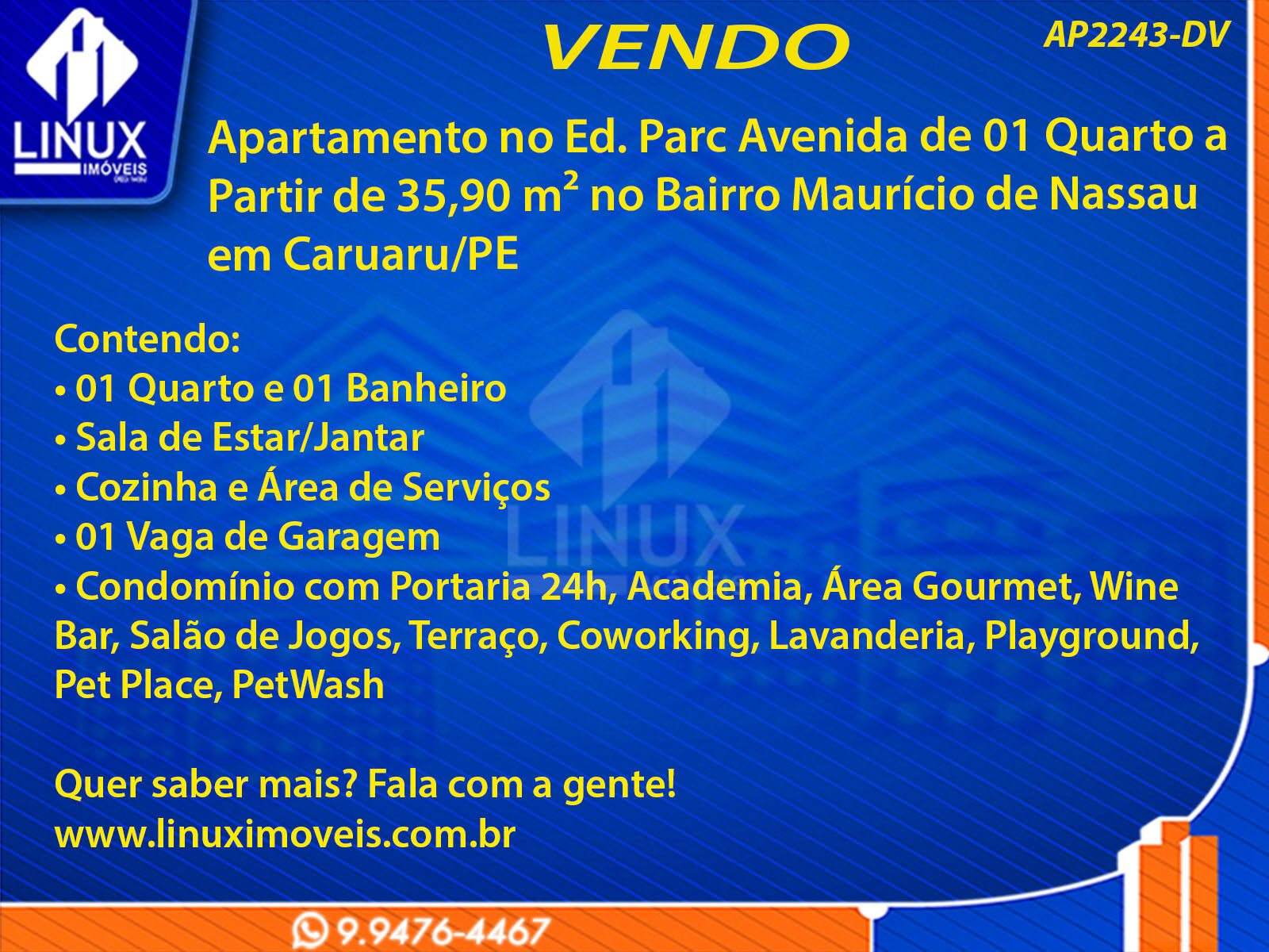 Apartamento no Ed. Parc Avenida de 01 Quarto a Partir de 35,90 m² no Bairro Maurício de Nassau em Caruaru/PE