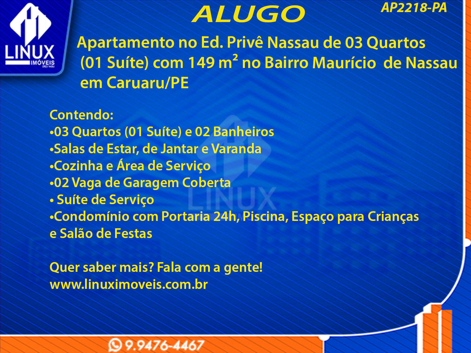 Apartamento no Ed. Privê Nassau em Caruaru/PE p/ Locação (AP2218-PA)