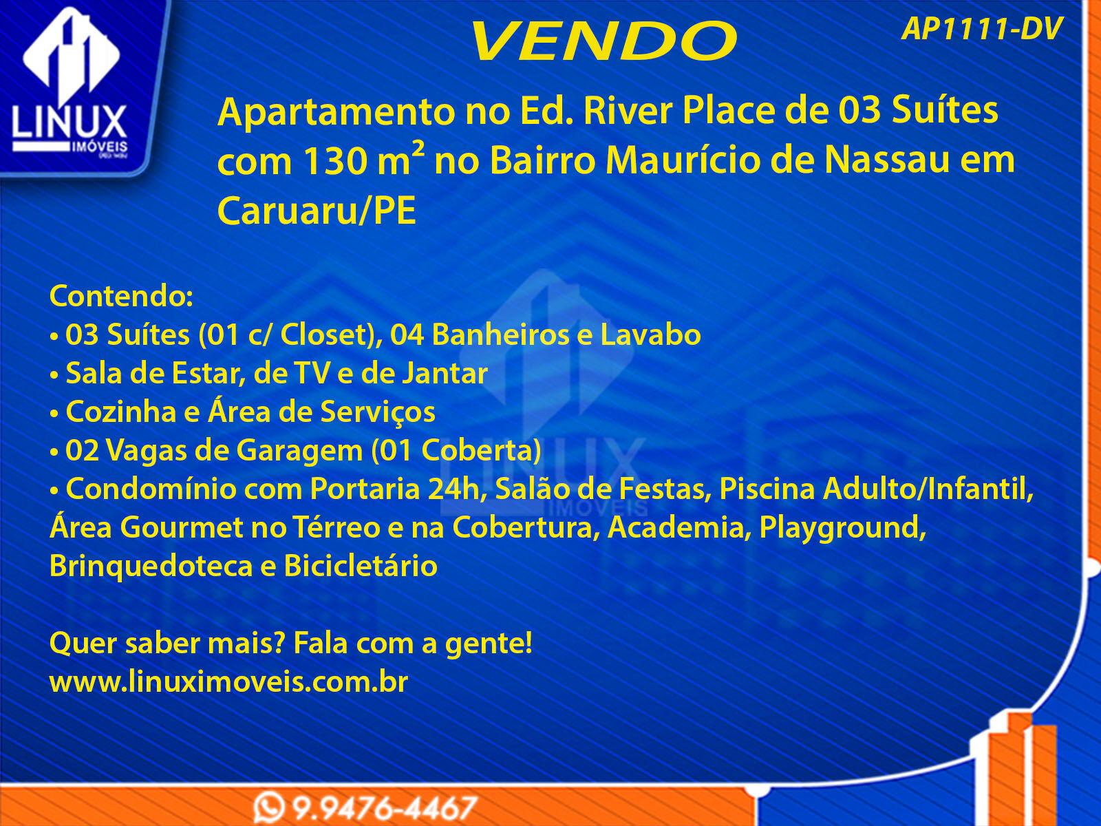 Apartamento no Ed. River Place de 03 Suítes com 130 m² no Bairro Maurício de Nassau em Caruaru/PE
