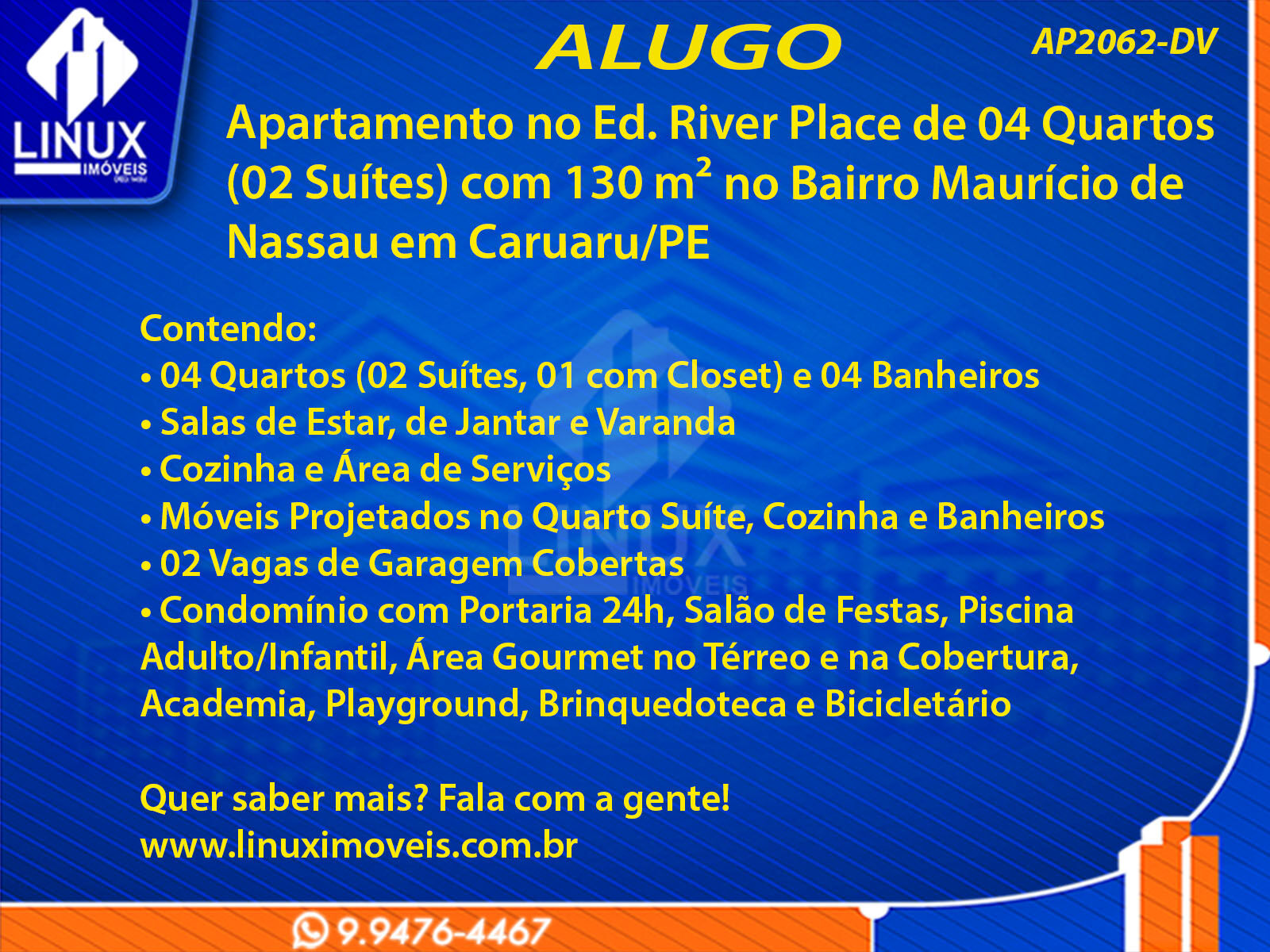 Apartamento no Ed. River Place de 04 Quartos (02 Suítes) com 130 m² no Bairro Maurício de Nassau em Caruaru/PE