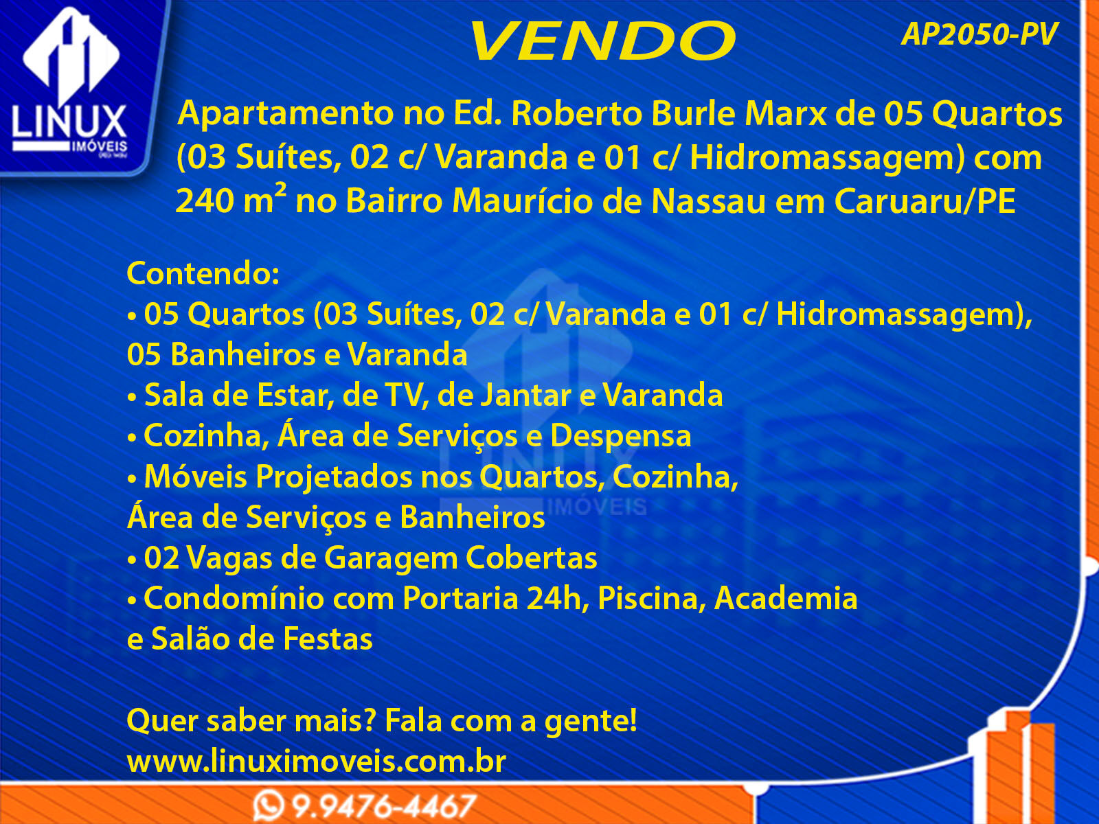 Apartamento no Ed. Roberto Burle Marx de 05 Quartos (03 Suítes, 02 c/ Varanda e 01 c/ Hidromassagem) com 240 m² no Bairro Maurício de Nassau em Caruaru/PE