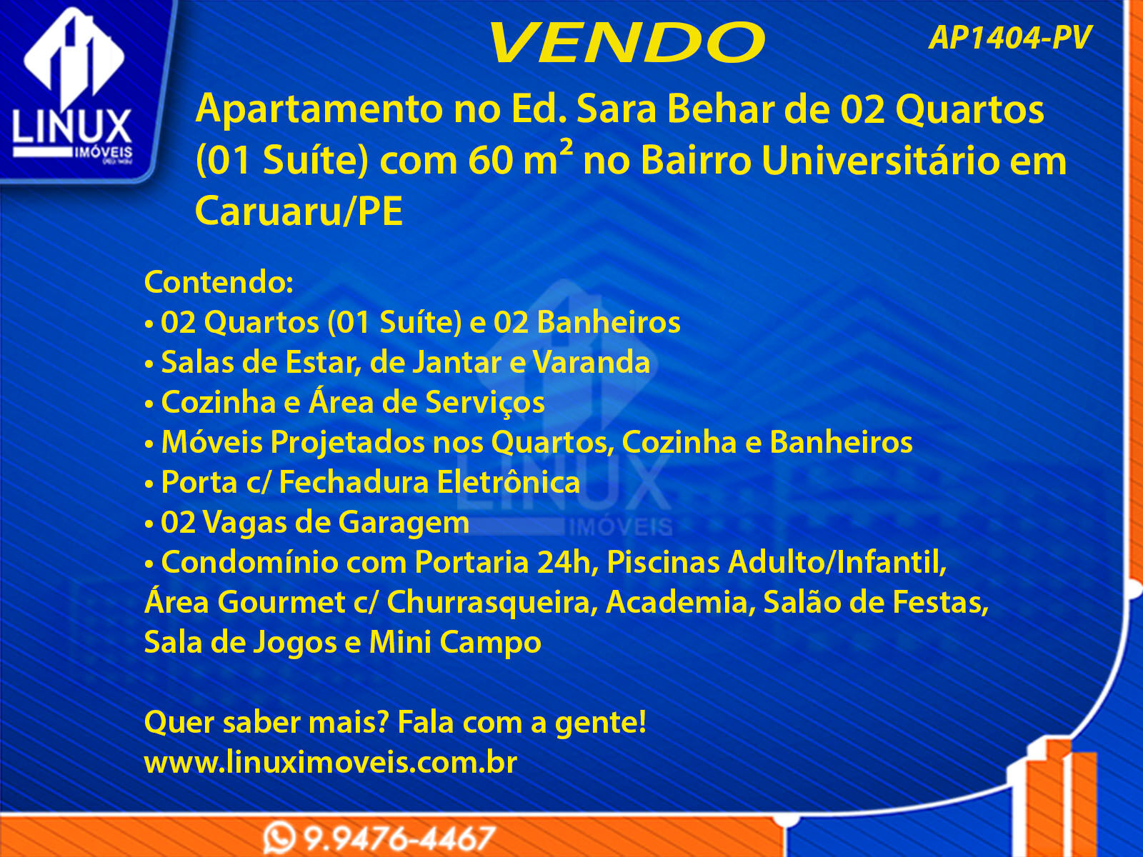 Apartamento no Ed. Sara Behar de 02 Quartos (01 Suíte) com 60 m² no Bairro Universitário em Caruaru/PE