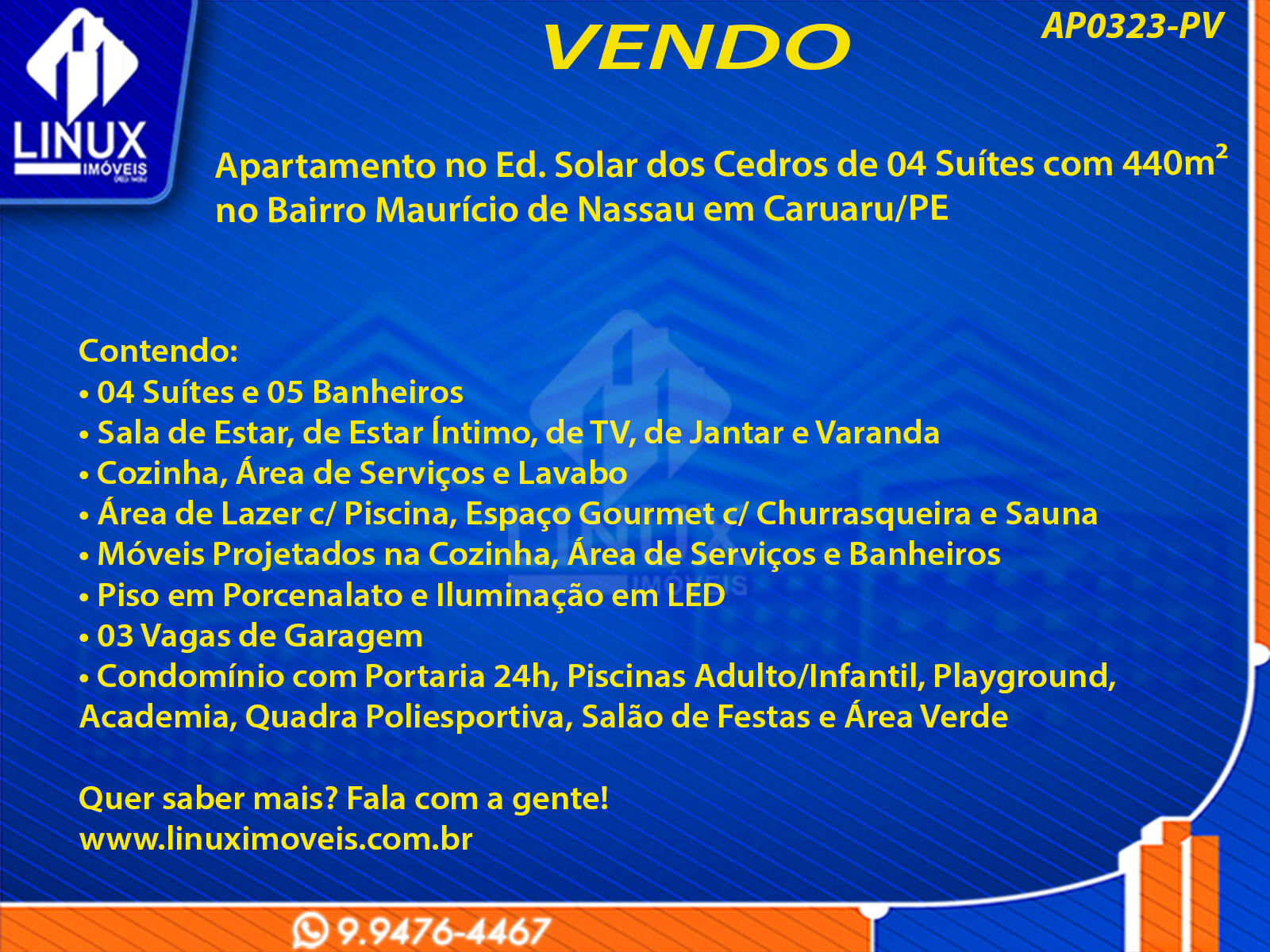Apartamento no Ed. Solar dos Cedros de 04 Suítes com 440m² no Bairro Maurício de Nassau em Caruaru/PE