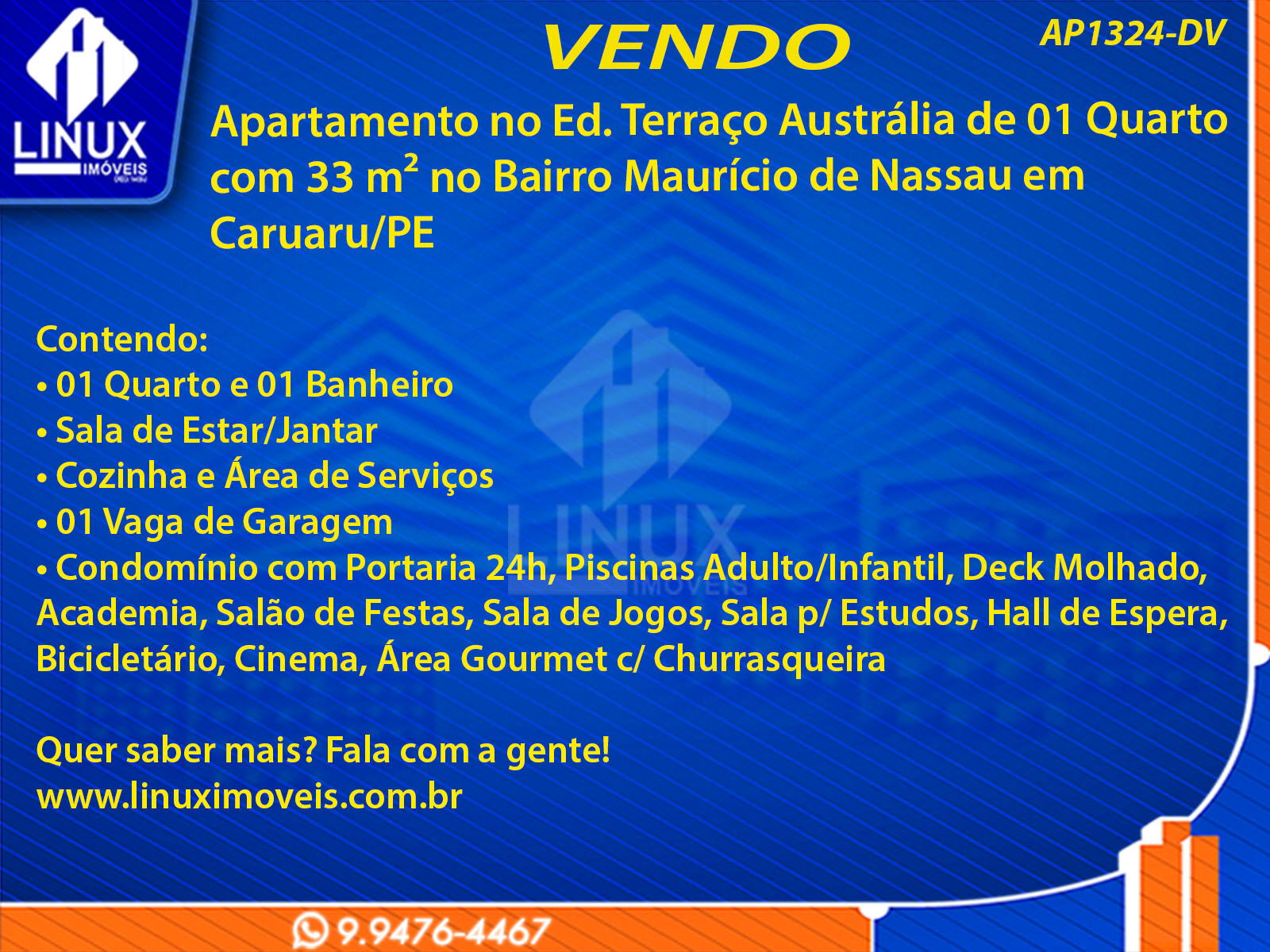 Apartamento no Ed. Terraço Austrália de 01 Quarto com 33 m² no Bairro Maurício de Nassau em Caruaru/PE