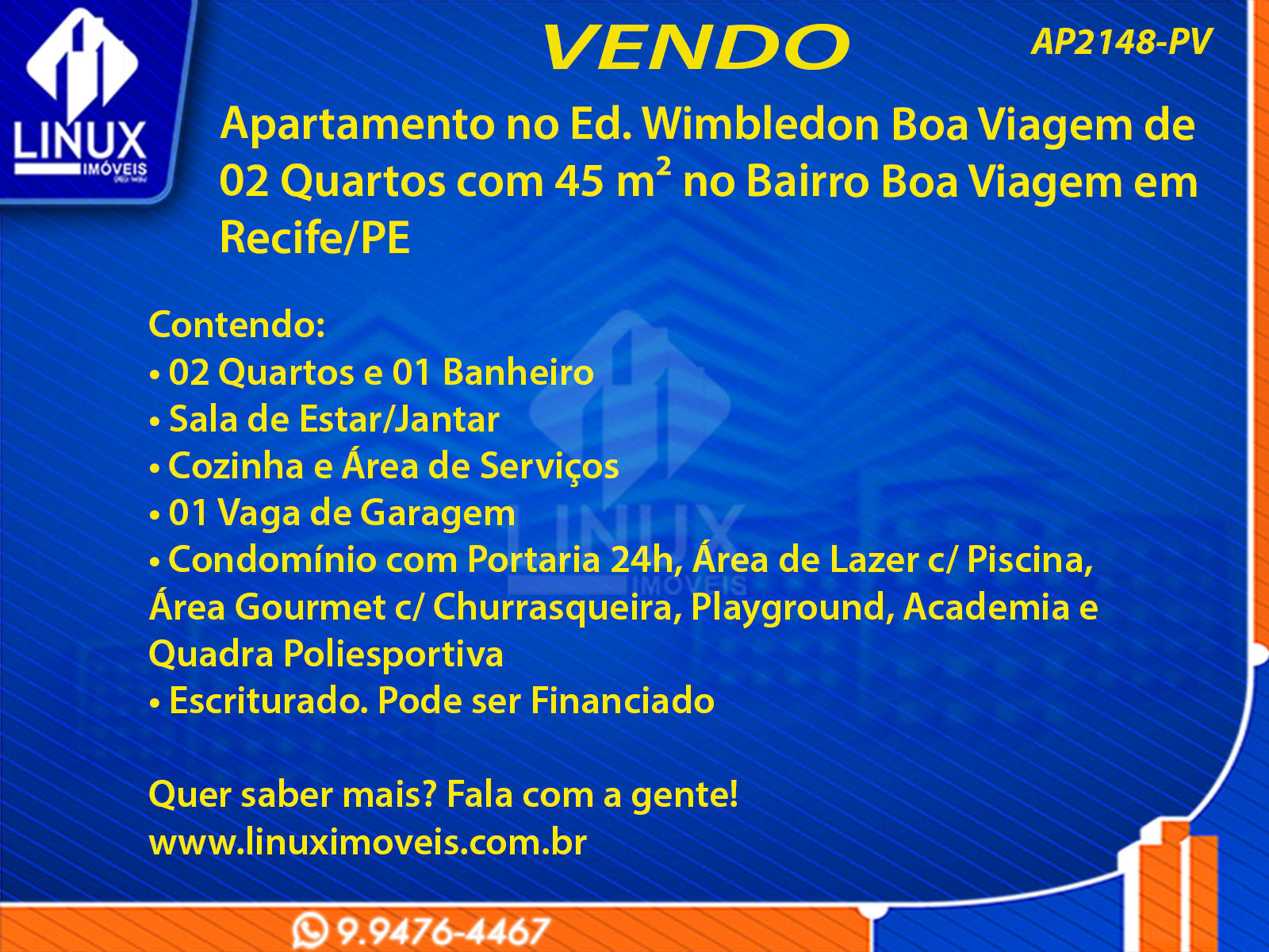 Apartamento no Ed. Wimbledon Boa Viagem em Recife/PE à Venda (AP2148-PV)