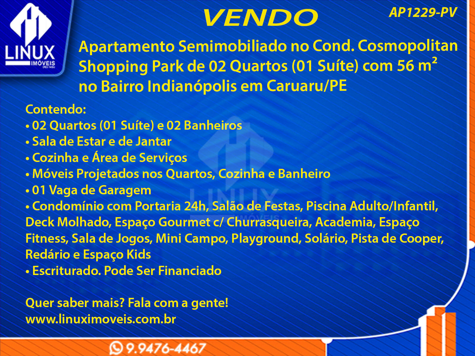R$450.000,00 / VENDAApartamento Semimobiliado no Cond. Cosmopolitan Shopping Park à Venda (AP1229-PV)