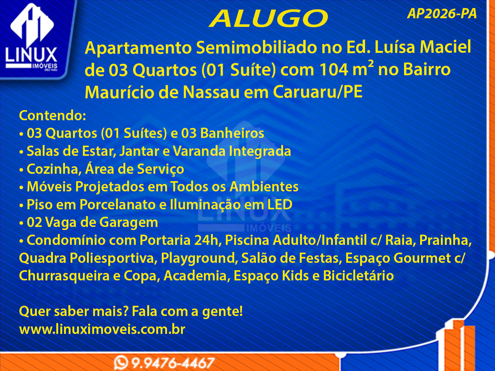 R$5.800,00 / ALUGUELApartamento Semimobiliado no Ed. Luísa Maciel em Caruaru/PE p/ Locação (AP2026-PA)