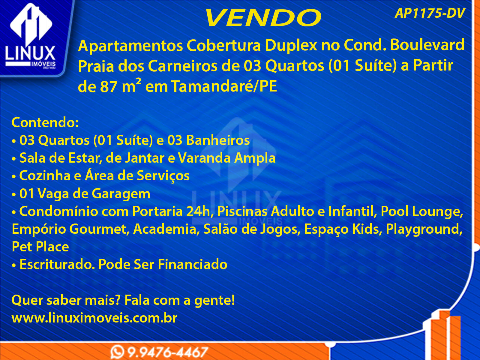 Apartamentos Cobertura Duplex no Cond. Boulevard Praia dos Carneiros à Venda (AP1175-DV)