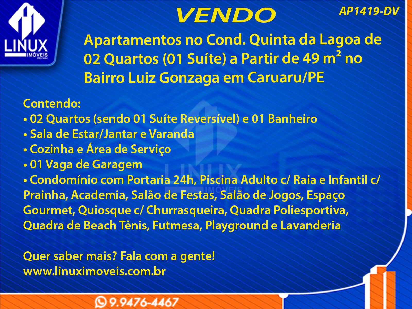 R$200.000,00 / VENDAApartamentos no Cond. Quinta da Lagoa em Caruaru/PE à Venda (AP1419-DV)