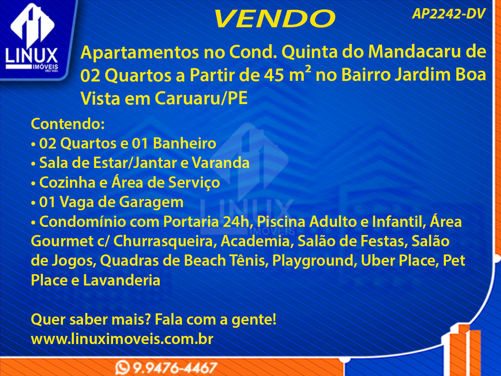 R$191.900,00 / VENDAApartamentos no Cond. Quinta do Mandacaru em Caruaru/PE à Venda (AP2242-DV)