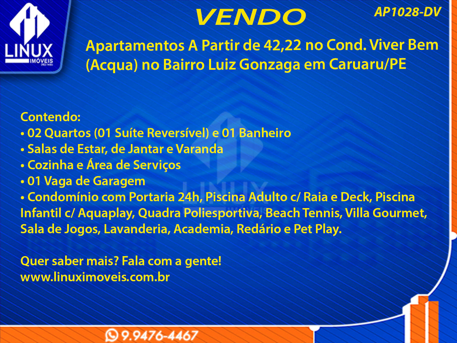 R$230.000,00 / VENDAApartamentos no Cond. Viver Bem Acqua em Caruaru/PE à Venda (AP1028-DV)