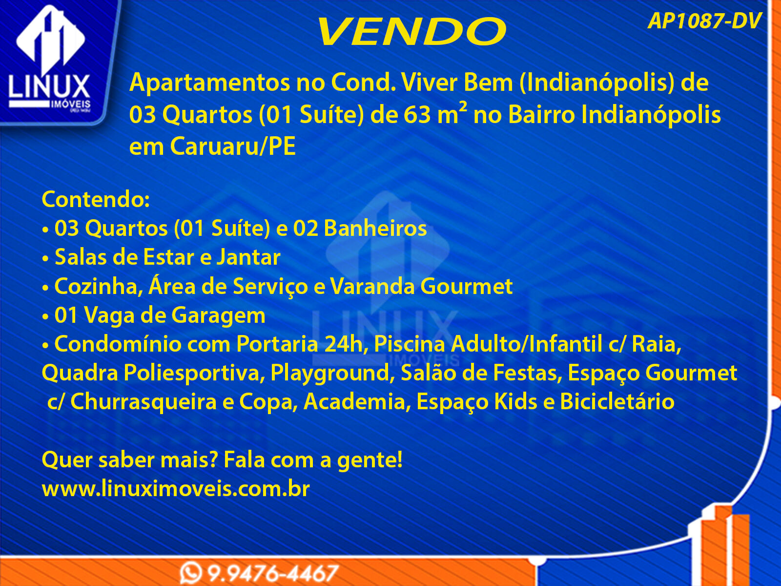 Apartamentos no Cond. Viver Bem Indianópolis de 03 Quartos (01 Suíte) de 63 m² no Bairro Indianópolis em Caruaru/PE