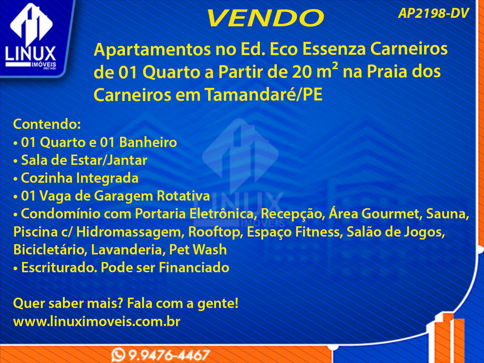 R$260.000,00 / VENDAApartamentos no Ed. Eco Essenza Carneiros em Tamandaré/PE à Venda (AP2198-DV)