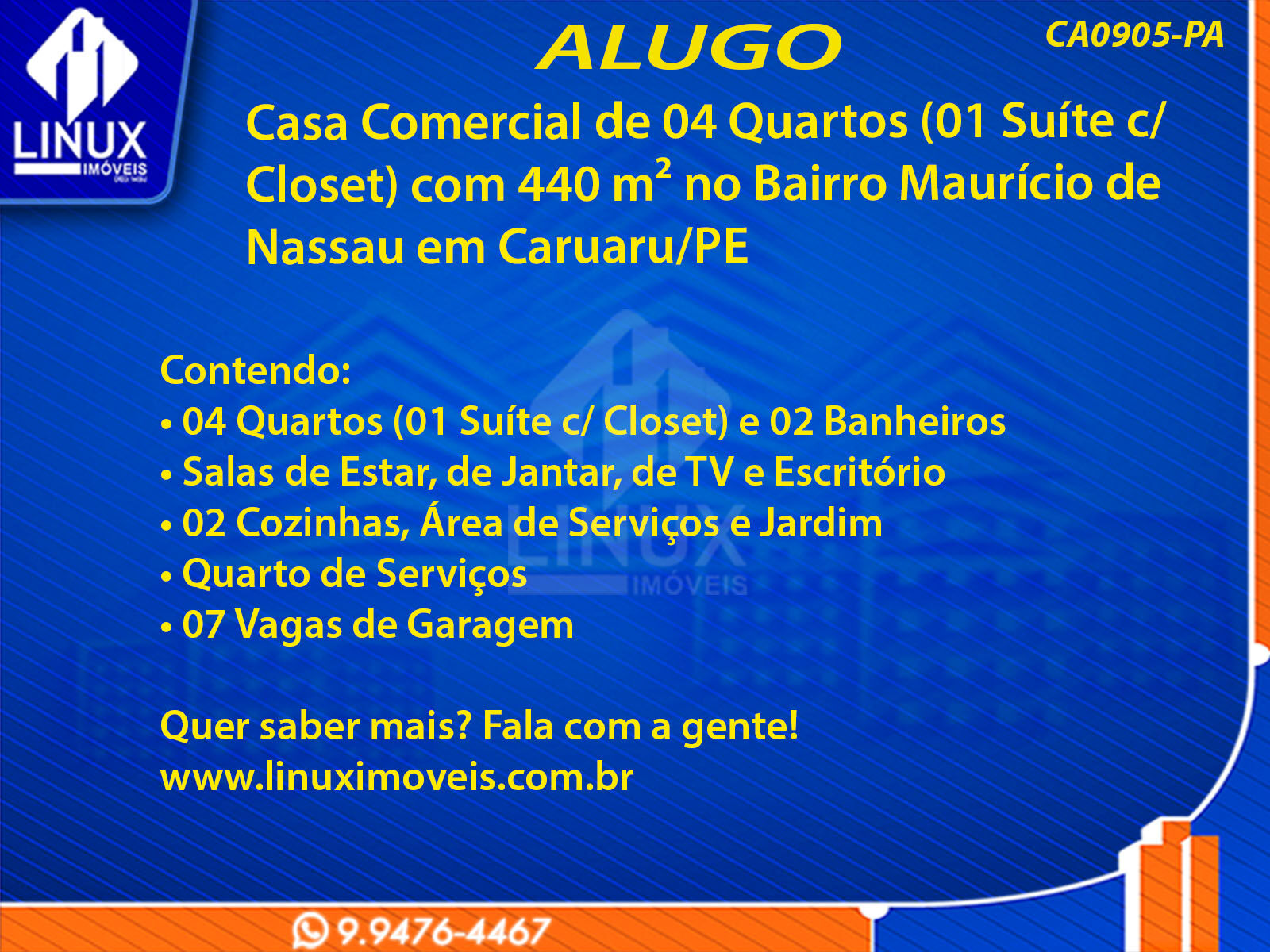 R$13.000,00 / ALUGUELCasa Comercial no Bairro Maurício de Nassau em Caruaru/PE p/ Locação (CA0905-PA)
