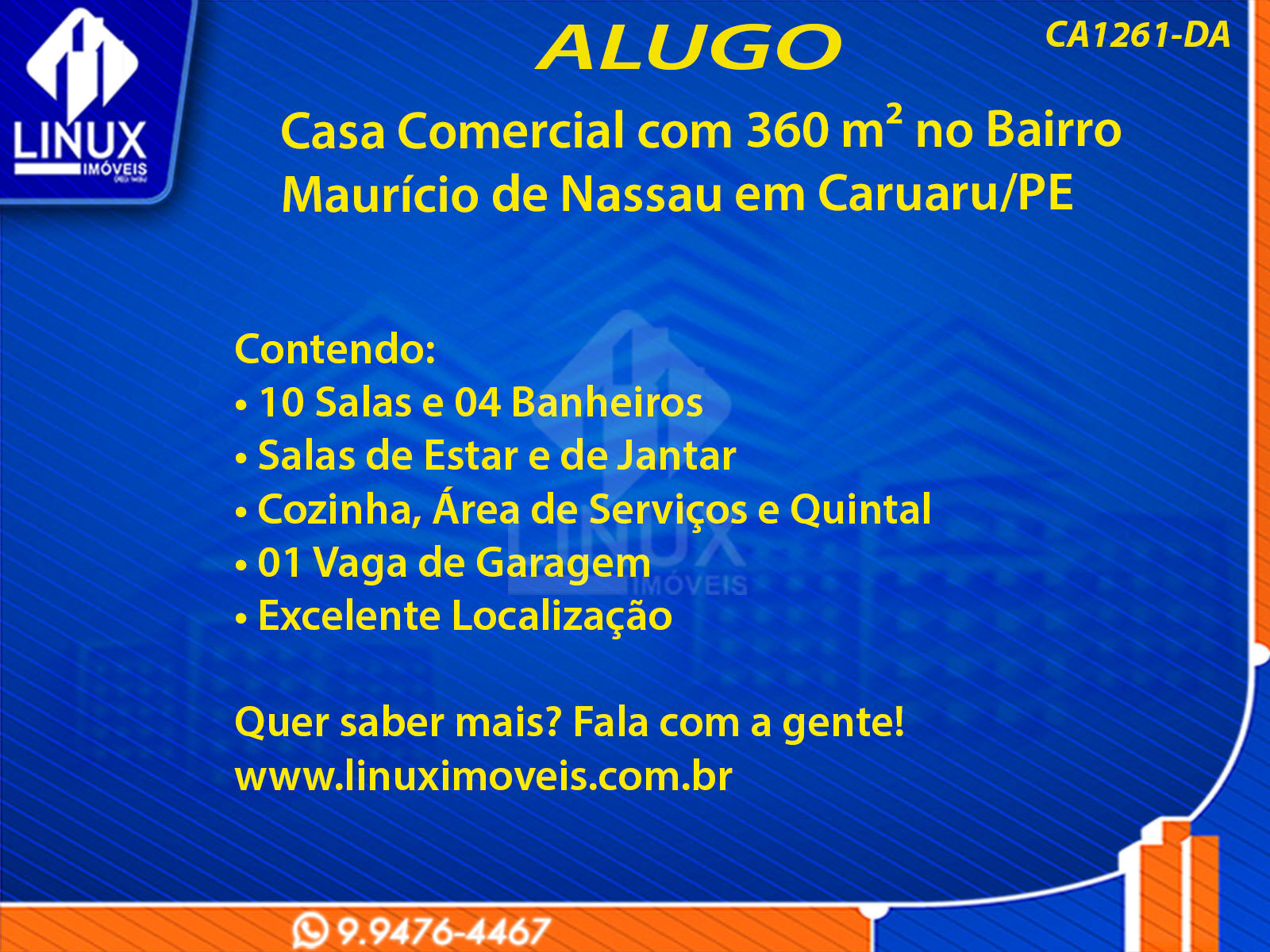 R$10.000,00 / ALUGUELCasa Comercial no Bairro Maurício de Nassau em Caruaru/PE p/ Locação (CA1261-DA)