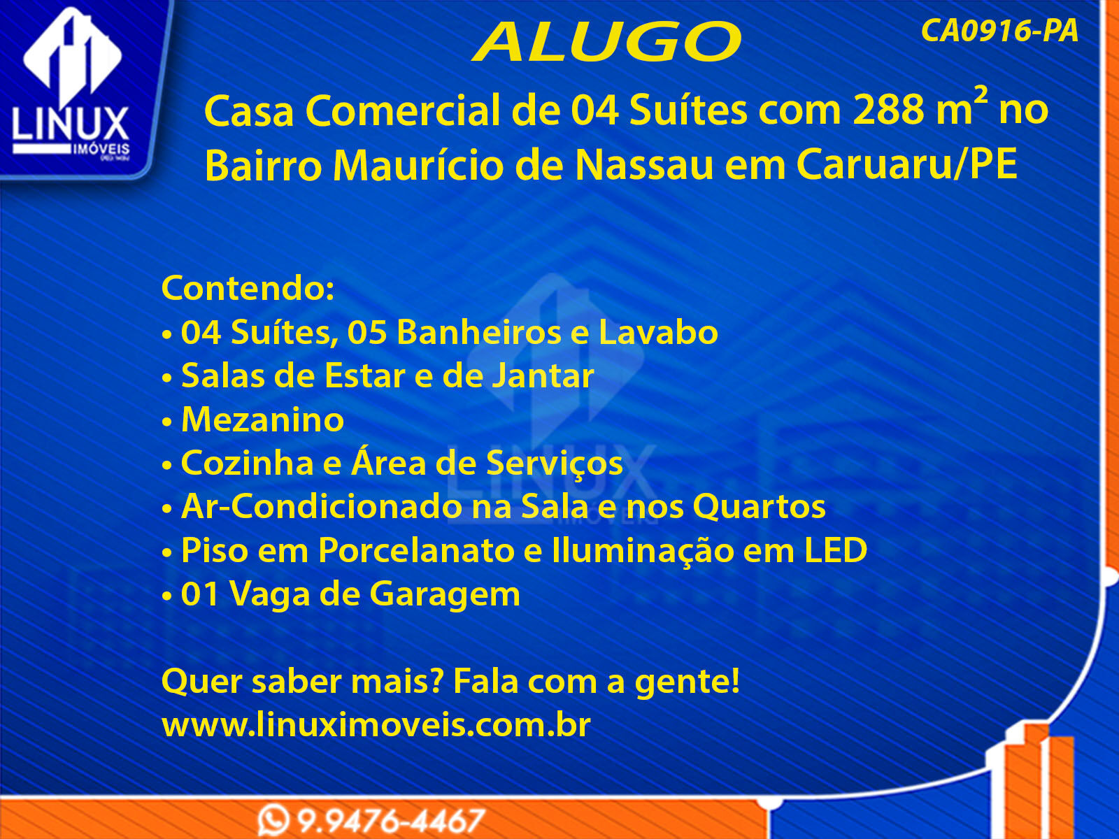 R$7.000,00 / ALUGUELCasa Comercial no Bairro Maurício de Nassau em Caruaru/PE p/ Locação (CA0916-PA)