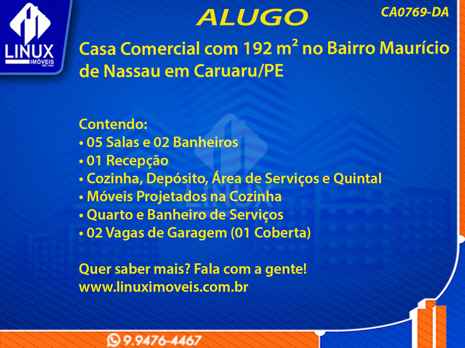 R$5.500,00 / ALUGUELCasa Comercial no Bairro Maurício de Nassau em Caruaru/PE p/ Locação (CA0769-DA)