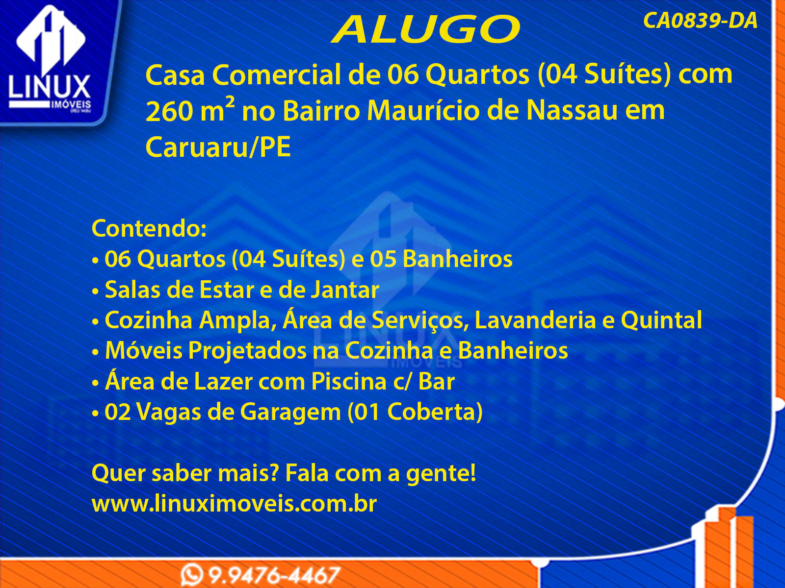 R$6.000,00 / ALUGUELCasa Comercial no Bairro Maurício de Nassau em Caruaru/PE p/ Locação (CA0839-DA)