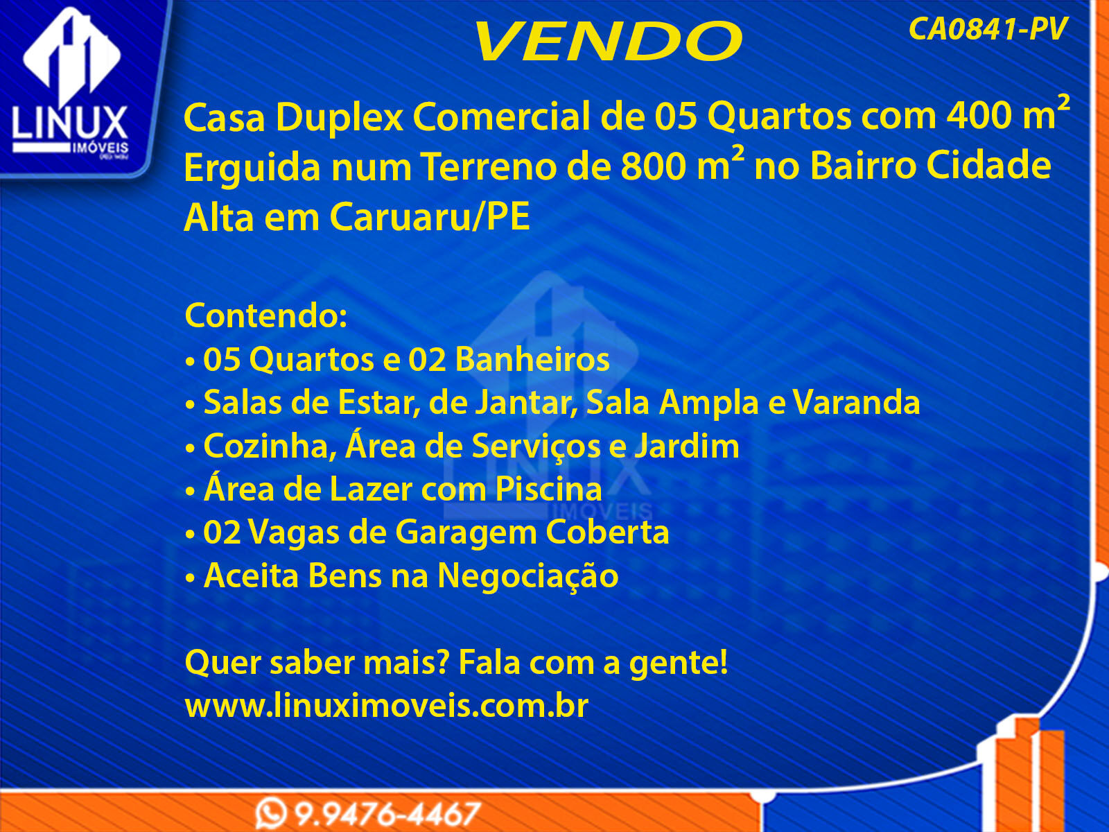 R$660.000,00 / VENDACasa Duplex Comercial no Bairro Cidade Alta em Caruaru/PE à Venda (CA0841-PV)