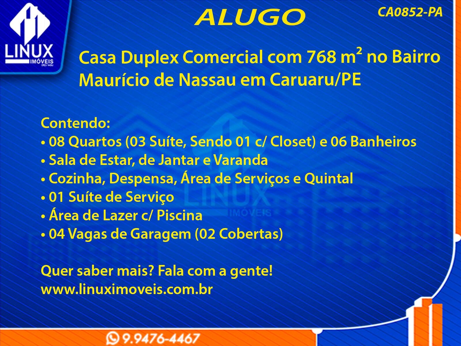 R$20.000,00 / ALUGUELCasa Duplex Comercial no Bairro Maurício de Nassau em Caruaru/PE p/ Locação (CA0852-PA)