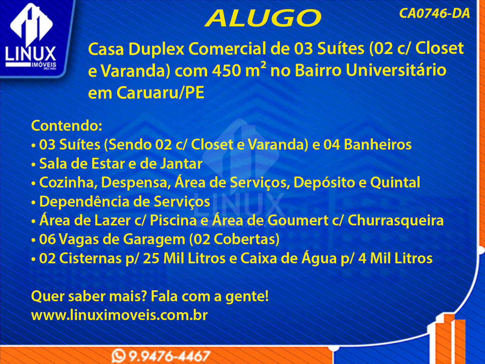 R$10.000,00 / ALUGUELCasa Duplex Comercial no Bairro Universitário em Caruaru/PE p/ Locação (CA0746-DA)