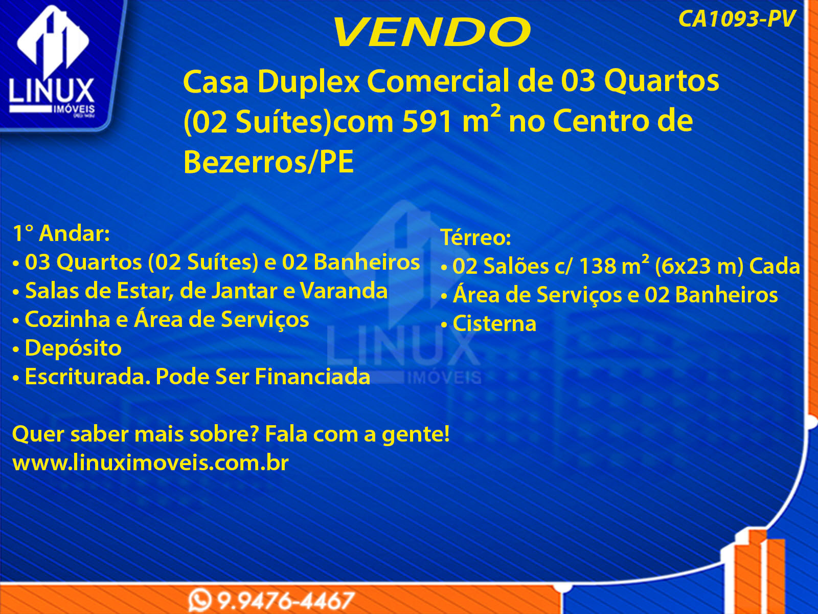 Casa Duplex Comercial no Centro de Bezerros/PE à Venda (CA1093-PV)