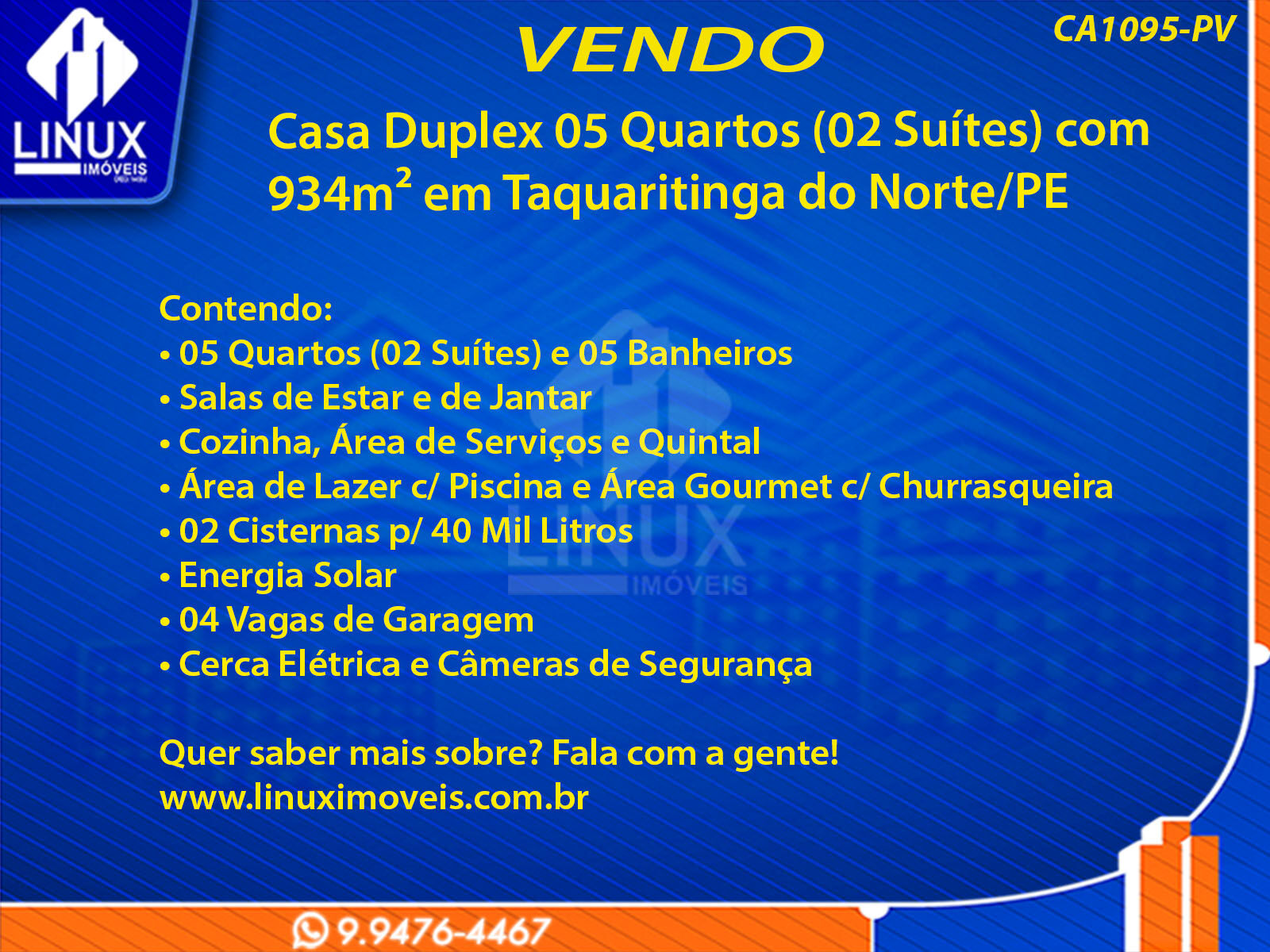 Casa Duplex 05 Quartos (02 Suítes) com 934m² em Taquaritinga do Norte/PE