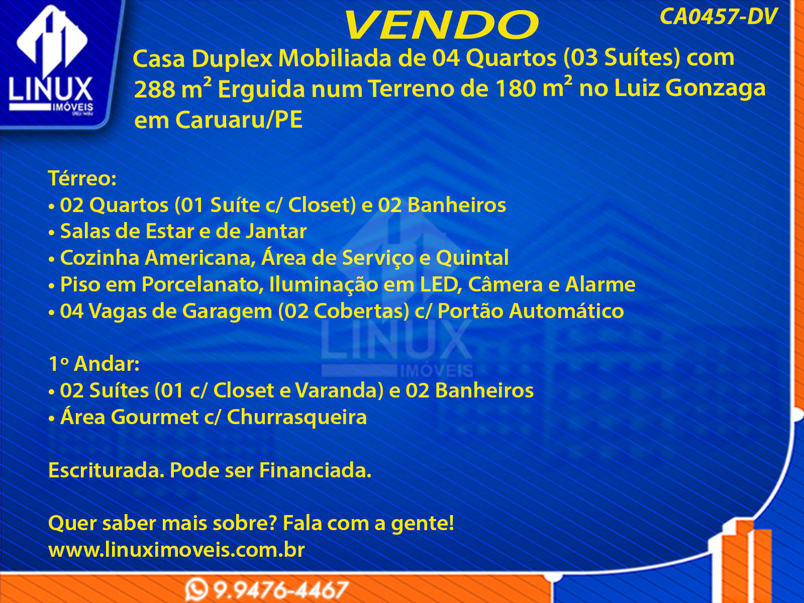 R$1.150.000,00 / VENDACasa Duplex Mobiliada no Bairro Luiz Gonzaga em Caruaru/PE à Venda (CA0457-DV)