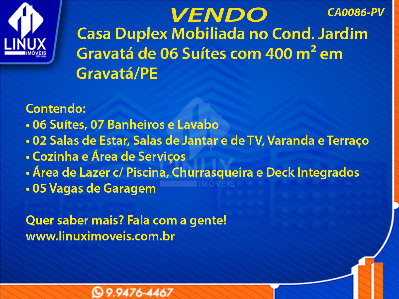 R$1.800.000,00 / VENDACasa Duplex Mobiliada no Cond. Jardim Gravatá em Gravatá à Venda (CA0086-PV)