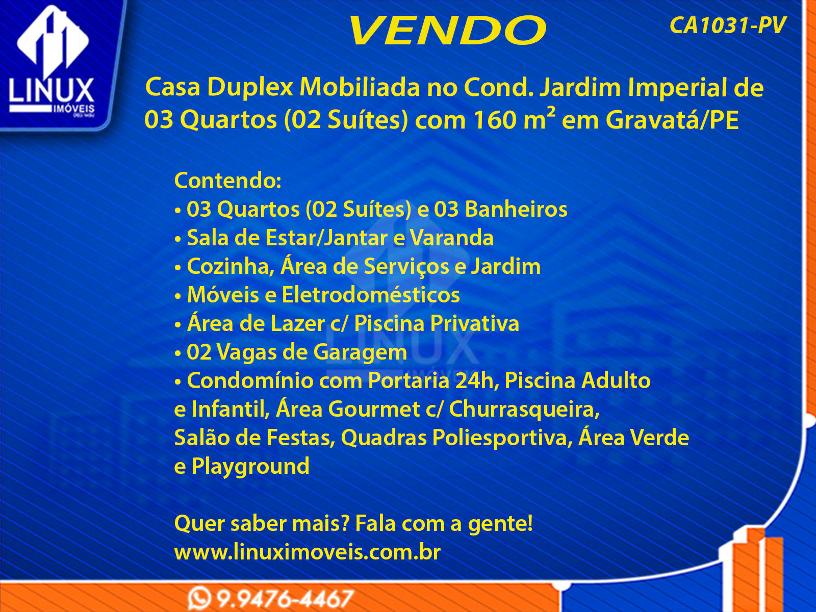 R$420.000,00 / VENDACasa Duplex Mobiliada no Cond. Jardim Imperial em Gravatá/PE à Venda (CA1031-PV)