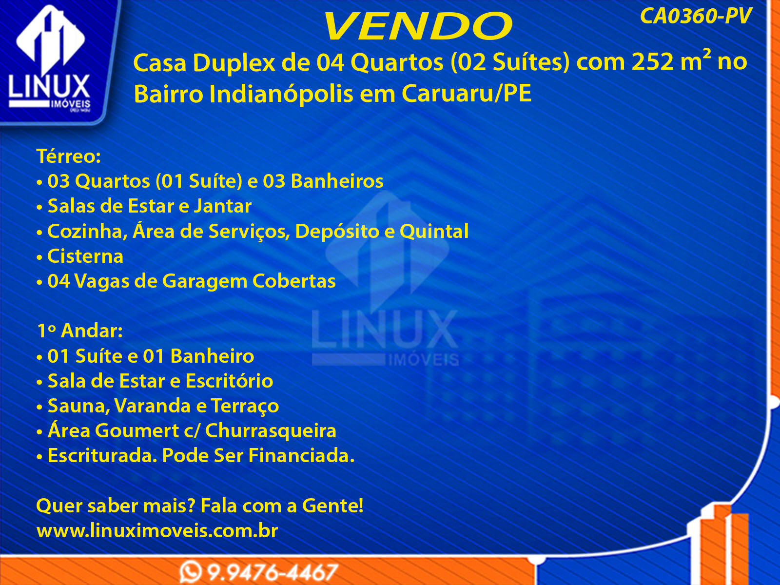 Casa Duplex de 04 Quartos (02 Suítes) com 252 m² no Bairro Indianópolis em Caruaru/PE