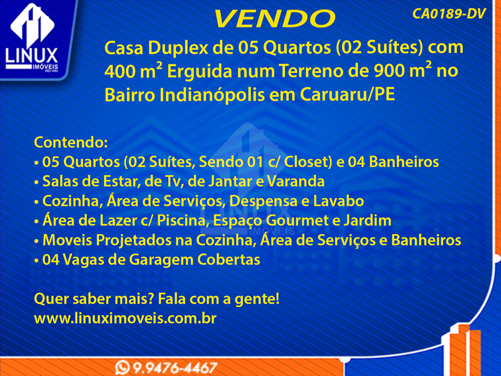 R$1.900.000,00 / VENDACasa Duplex no Bairro Indianópolis em Caruaru/PE à Venda (CA0189-DV)