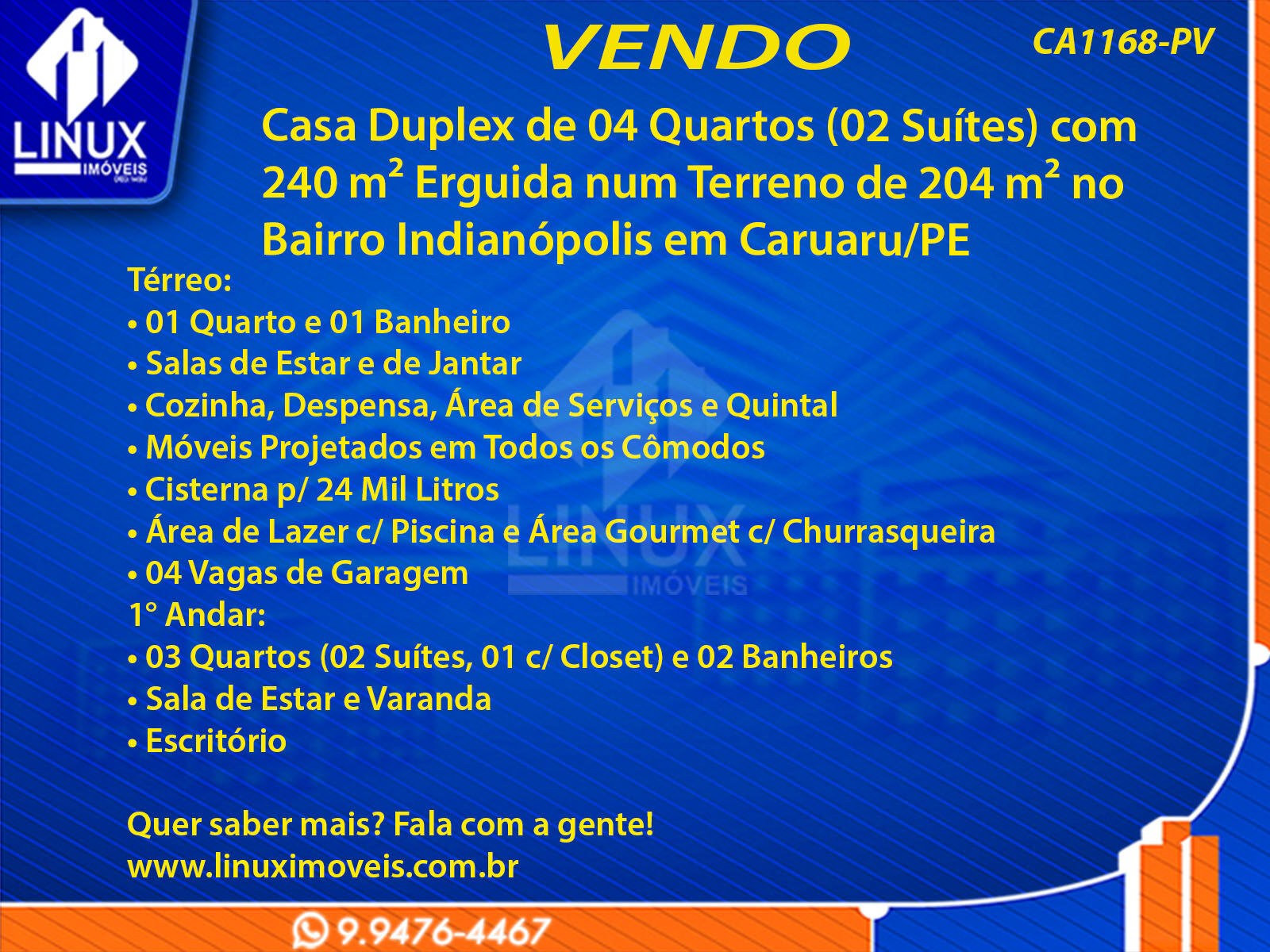 Casa Duplex no Bairro Indianópolis em Caruaru/PE à Venda (CA1168-PV)