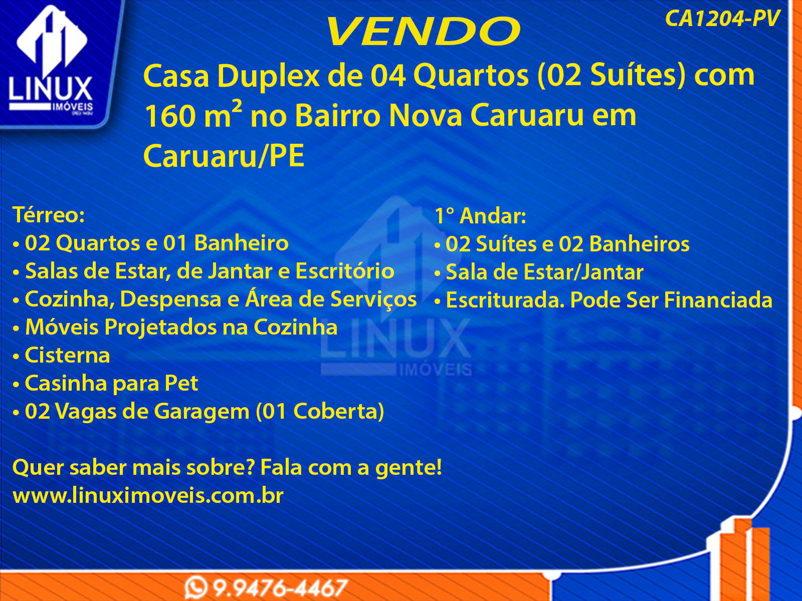 R$280.000,00 / VENDACasa Duplex no Bairro Nova Caruaru em Caruaru/PE à Venda (CA1204-PV)