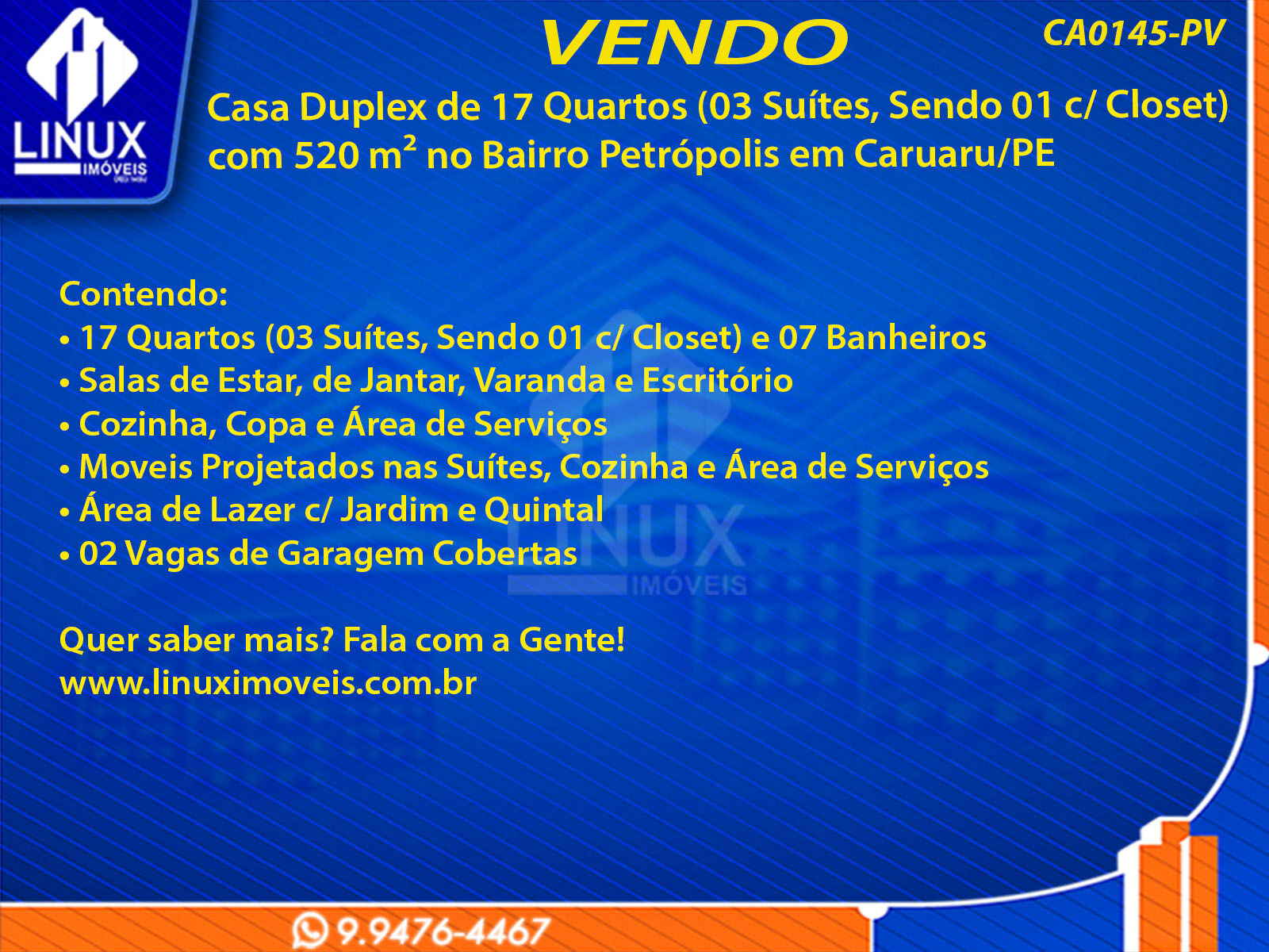 Casa Duplex de 17 Quartos (03 Suítes, Sendo 01 c/ Closet) com 520 m² no Bairro Petrópolis em Caruaru/PE