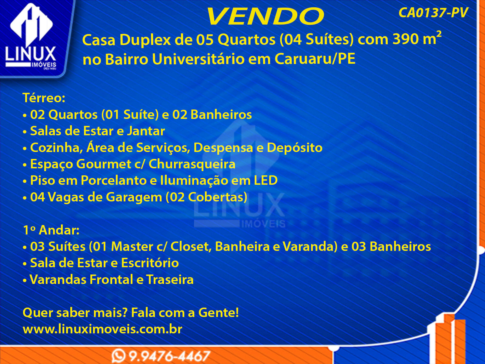 Casa Duplex de 05 Quartos (04 Suítes) com 390 m² no Bairro Universitário em Caruaru/PE