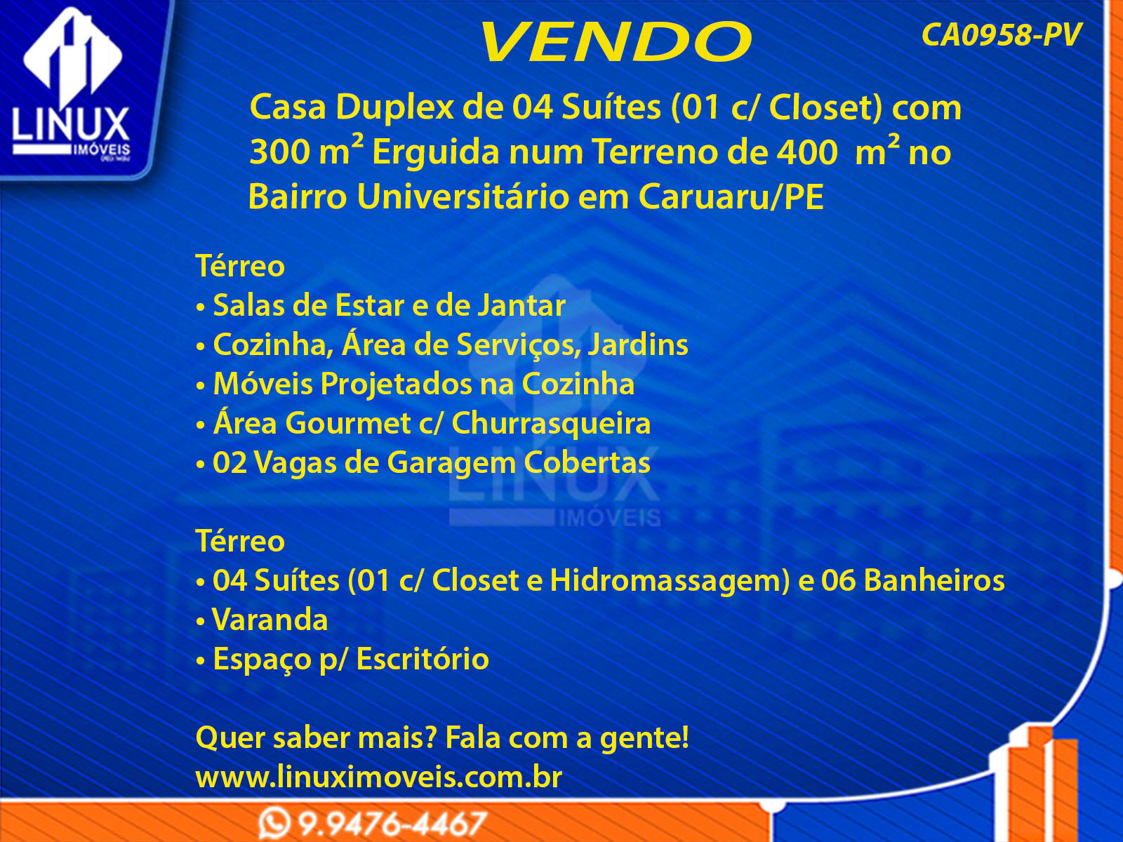R$1.350.000,00 / VENDACasa Duplex no Bairro Universitário em Caruaru/PE à Venda (CA0958-PV)