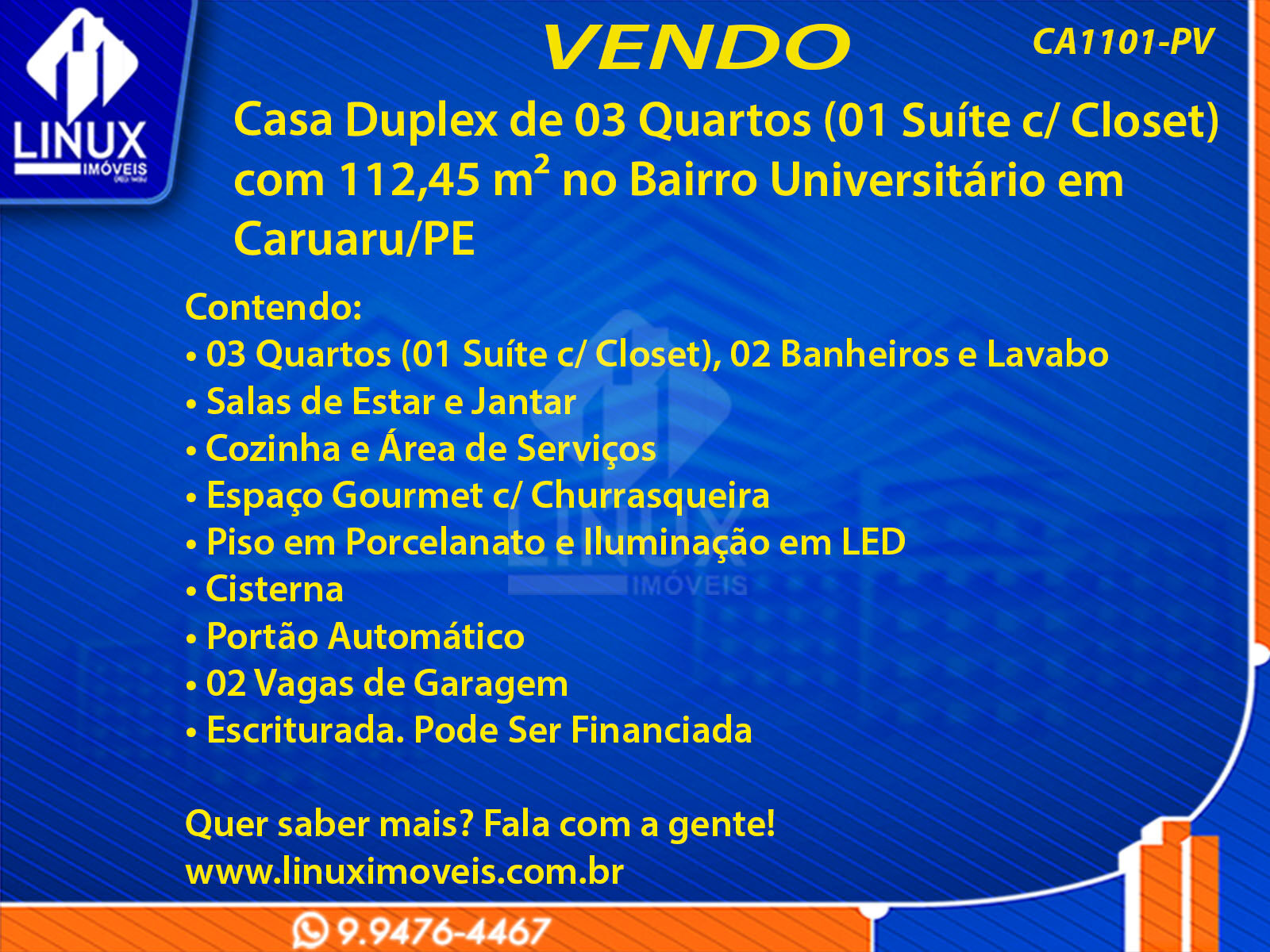 Casa Duplex no Bairro Universitário em Caruaru/PE à Venda (CA1101-PV)