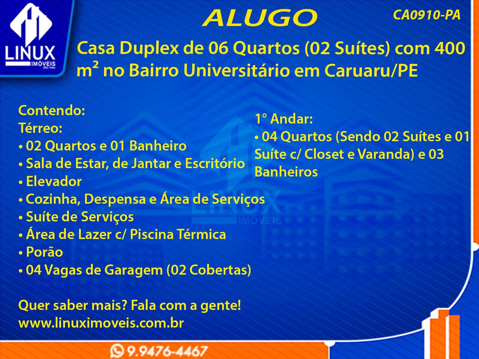 Casa Duplex no Bairro Universitário em Caruaru/PE p/ Locação (CA0910-PA)