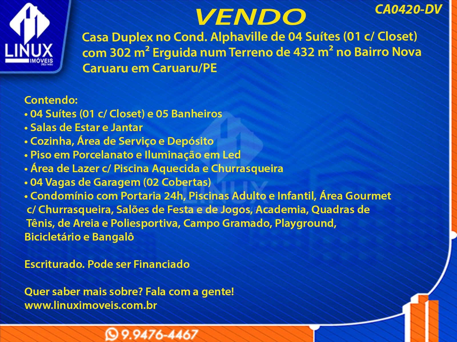 R$2.300.000,00 / VENDACasa Duplex no Cond. Alphaville Caruaru à Venda (CA0420-DV)