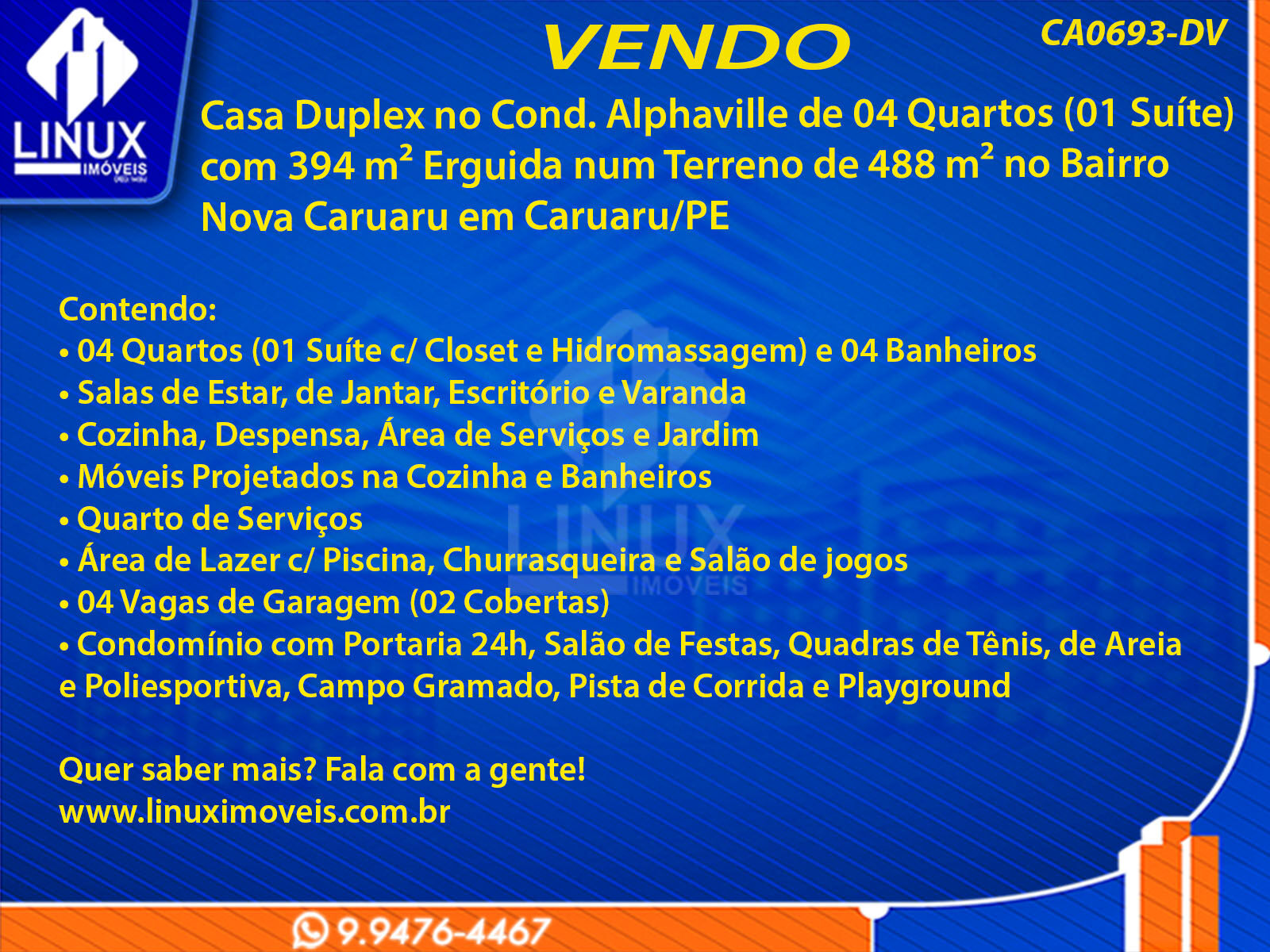 Casa Duplex no Cond. Alphaville Caruaru à Venda (CA0693-DV)