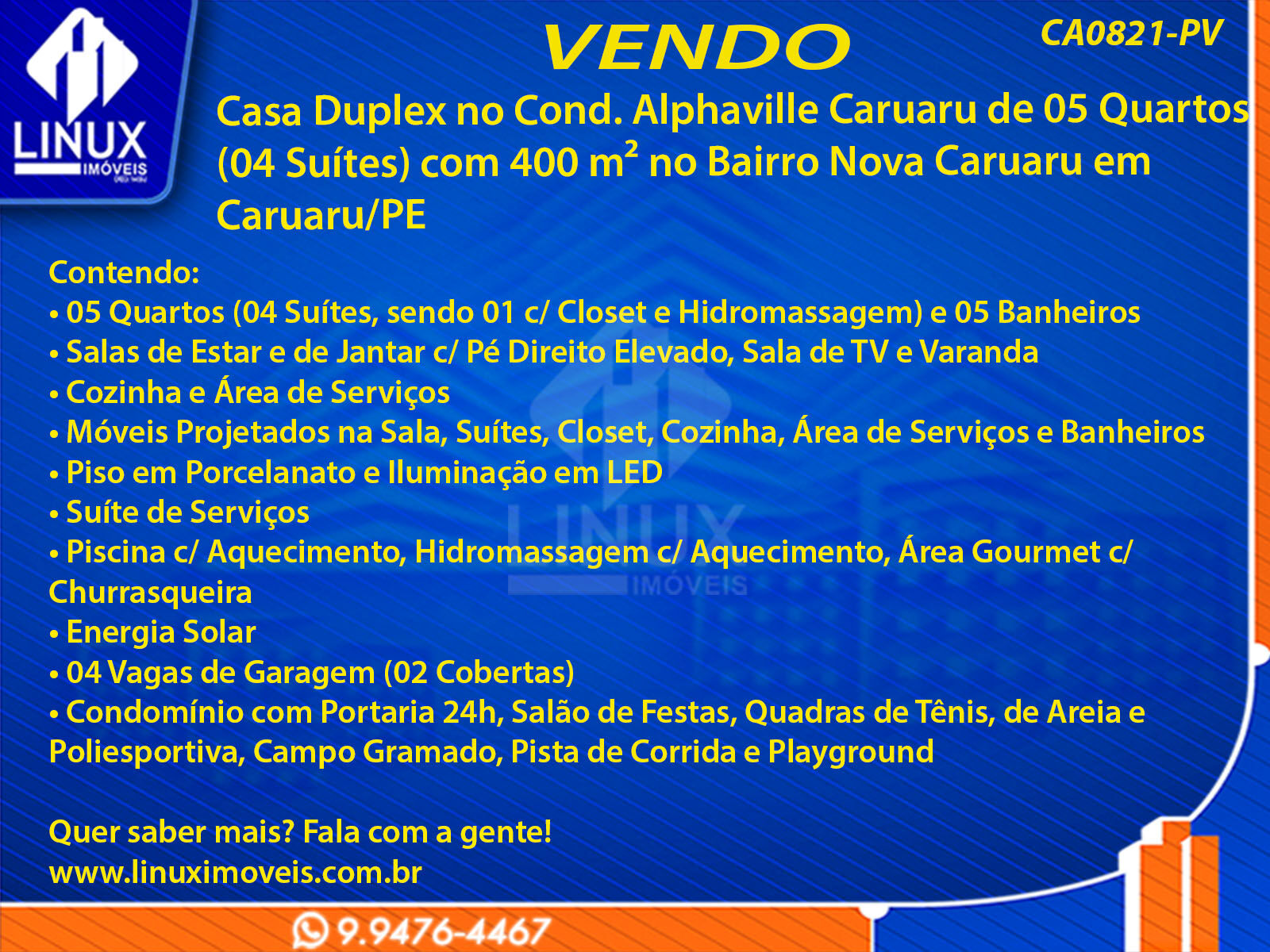 Casa Duplex no Cond. Alphaville Caruaru em Caruaru/PE à Venda (CA0821-PV)