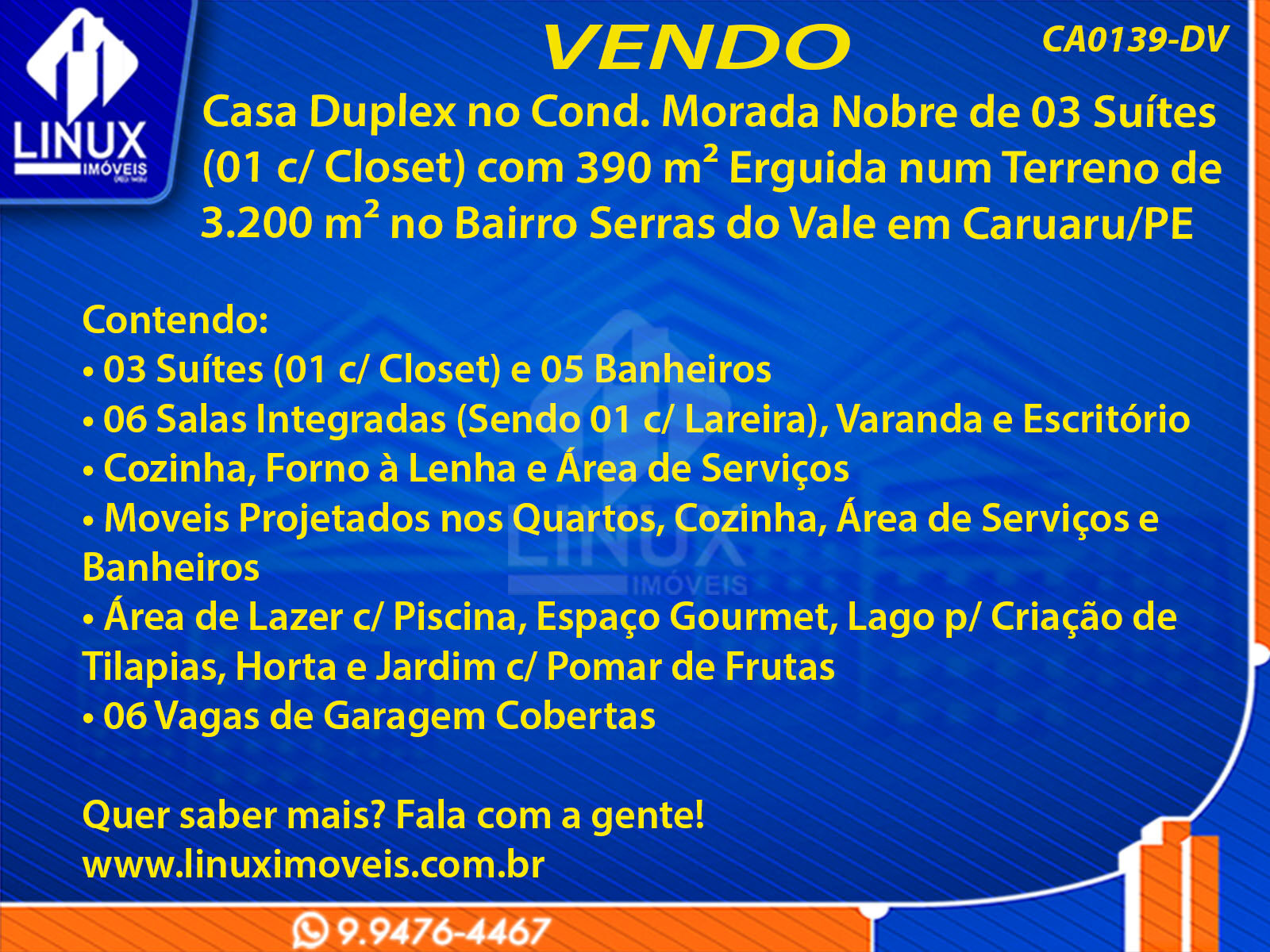 Casa Duplex no Cond. Morada Nobre de 03 Suítes (01 c/ Closet) com 390 m² Erguida num Terreno de 3.200 m² no Bairro Serras do Vale em Caruaru/PE
