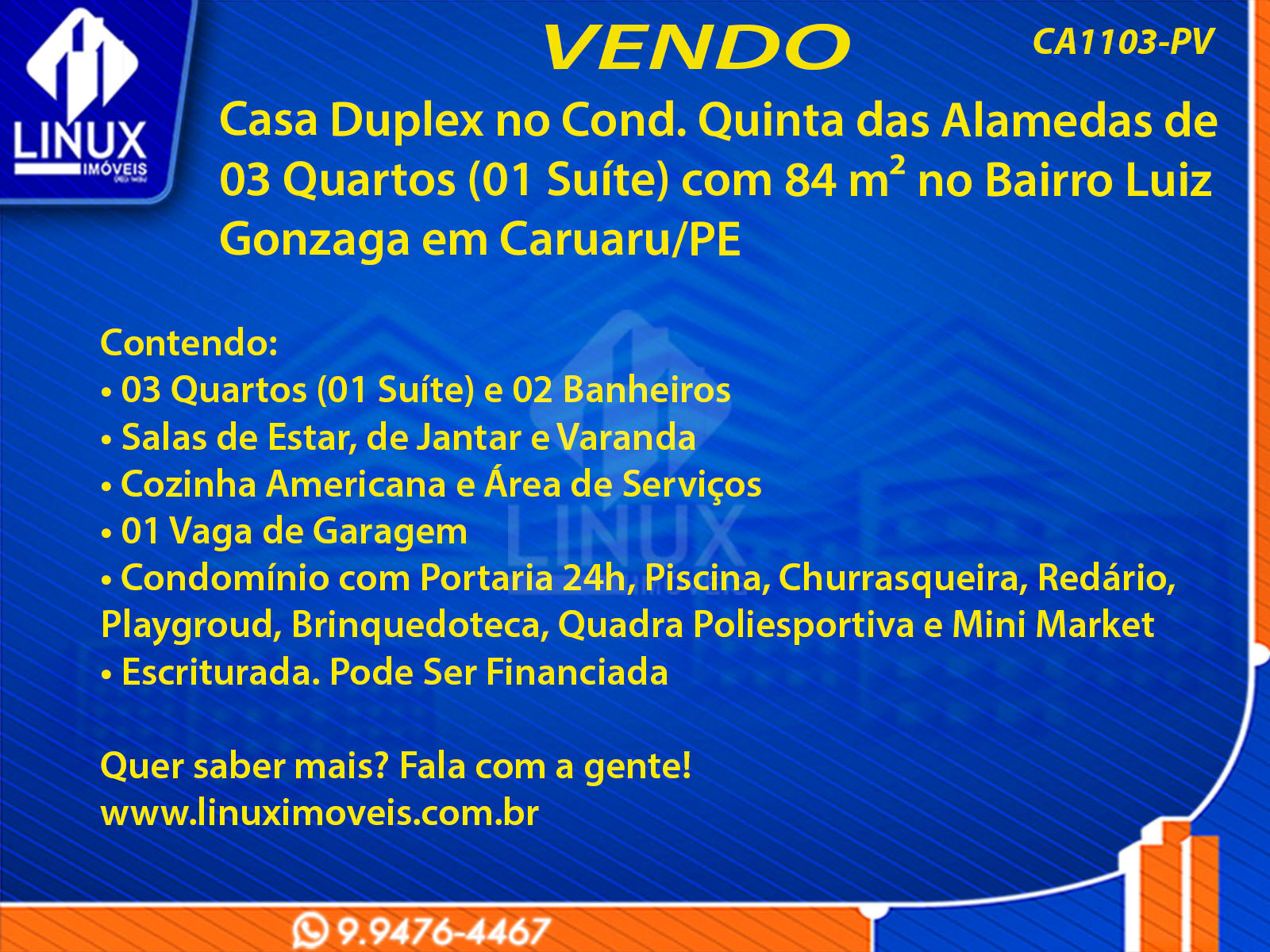 R$327.000,00 / VENDACasa Duplex no Cond. Quinta das Alamedas em Caruaru/PE à Venda (CA1103-PV)